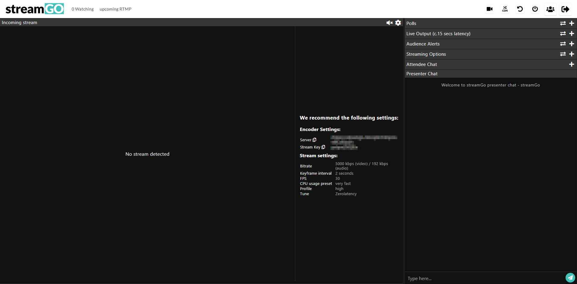 When your rtmp studio has launched you will see the rtmp details unique to your current instance along with the recomended settings to use in your streaming software